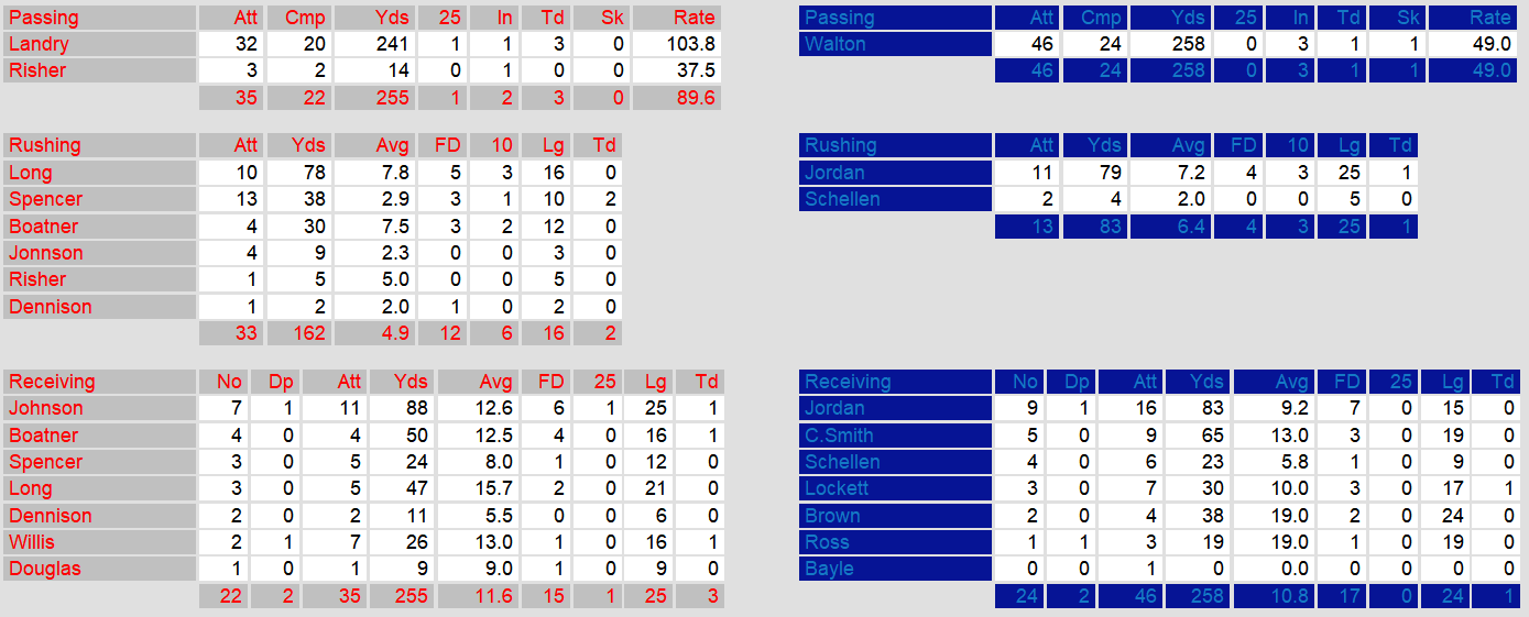 Chicago routed Boston on Sunday afternoon to push their record to 4-1 on the year. They started the scoring with an interception return for a touchdown. After Boston tied it, they scored 35 unanswered points with two touchdown runs by Tim Spencer and 3 passes by Greg Landry.