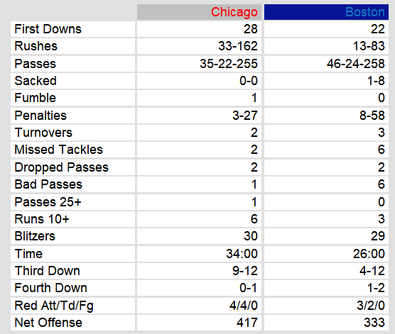 Chicago routed Boston on Sunday afternoon to push their record to 4-1 on the year. They started the scoring with an interception return for a touchdown. After Boston tied it, they scored 35 unanswered points with two touchdown runs by Tim Spencer and 3 passes by Greg Landry.