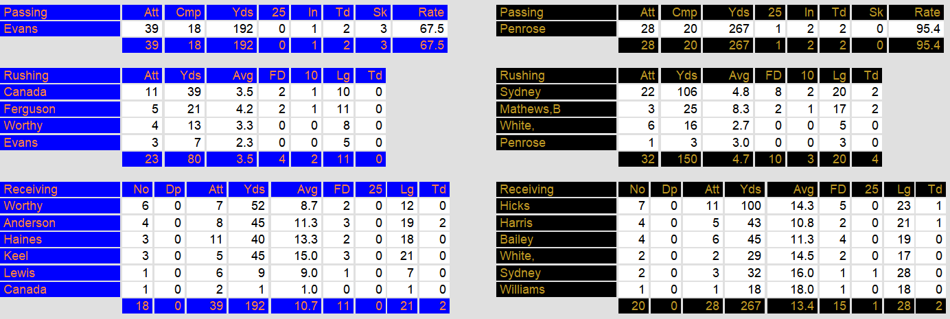 Denver routed Arizona Sunday night in a battle between the two teams. They incorporated a balanced attack. Quarterback Craig Penrose threw for 267 yards and two touchdowns. Their two running backs added 2 touchdowns each. Their defense forced 3 turnovers and held the Wranglers to 246 yards of total offense.