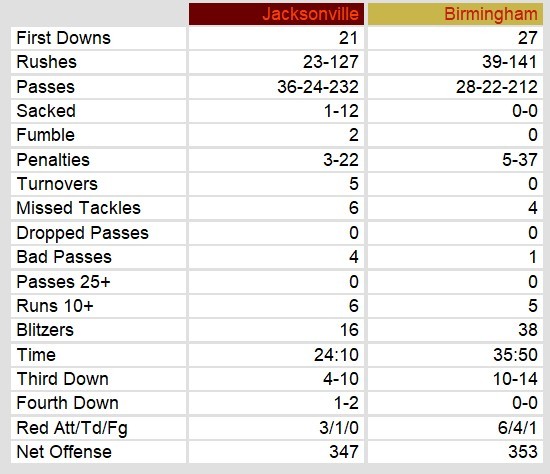 Jacksonville Bulls 7, Birmingham Stallions 38
