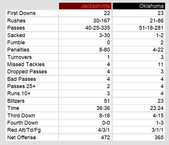 New Oklahoma running back (traded from Houston earlier in the week) struggled to find space to run behind the Oklahoma line. He ran for an uncharacteristic 59 yards on 11 rushes and no touchdowns. Quarterback Rick Johnson threw for three touchdowns. However, he also threw 2 costly interceptions.