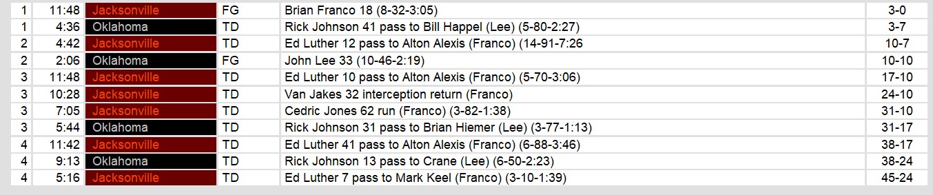 Dateline: Saturday March 8, 1986. On a beautiful Saturday afternoon in Tulsa Oklahoma, Outlaws fans were treated to an offensive spectacle. Unfortunately, as too often happens for them, that came at the expense of the home team. Jacksonville exploded for 45 points, including 21 in the third quarter and a total of 35 in the second half. Quarterback Ed Luther threw for 4 touchdowns, there of them to Alton Alexis.