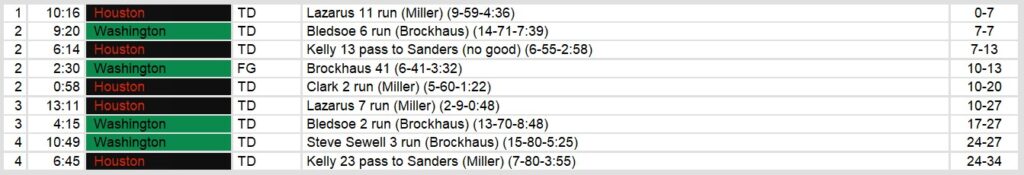 Dateline: Sunday, March 9, 1986. Houston kept pace in the Central divisional race, defeating Washington in the Astrodome. Jim Kelly threw only 13 passes, completing 10 of them and two for touchdowns. Without backup Fowler, Lazarus ran for 98 yards and 2 touchdowns as well.