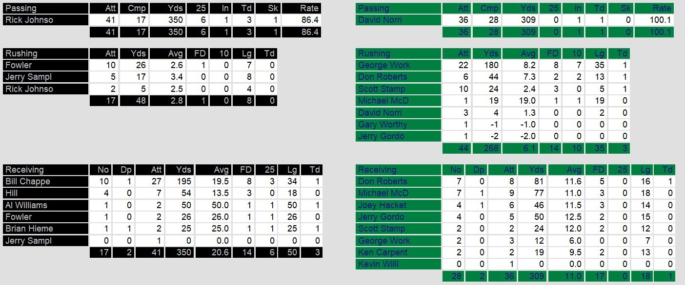 Dateline: Friday, March 15, 1986. On a warm Friday evening in Texas, the Outlaws and Gunslingers battled. Those in attendance were initially treated to a defensive battle, with Oklahoma leading 17-10 after 3 quarters. Things exploded in the 4th with both teams combining for 38 total points and Oklahoma winning on a Rick Johnson hail mary pass to Al Williams.