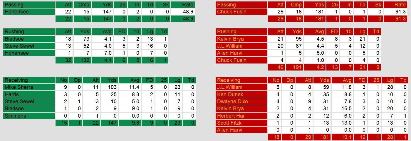 Washington broke through to the end zone first with a Bledsoe plunge. The lead held until Fusina finally found the end zone with about a minute and a half left in the game. Philadelphia dominated in all stats except for the scoreboard. But, as they say, a win is a win.