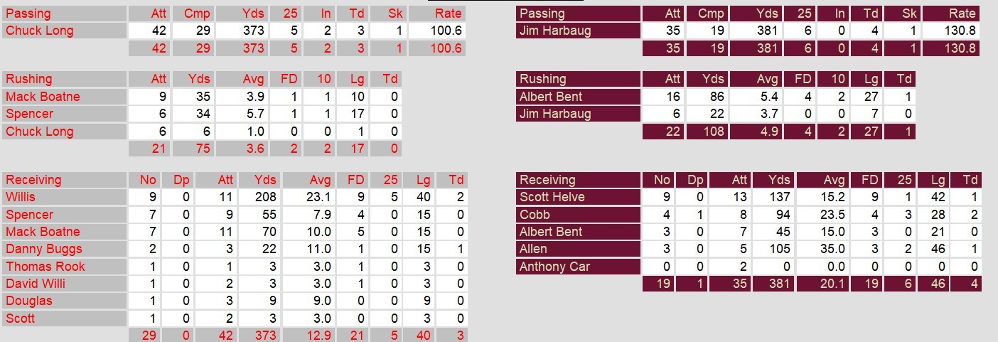 Dateline: Monday, March 18, 1986. New face, similar result. Michigan closed out week 7 of the 1986 season by dominating their divisional rival Chicago in the Silverdome. Chicago stayed close up to the third quarter before Michigan scored 13 unanswered in the 4th. The new face, of course, is quarterback Jim Harbaugh who threw for 4 touchdowns in the game.