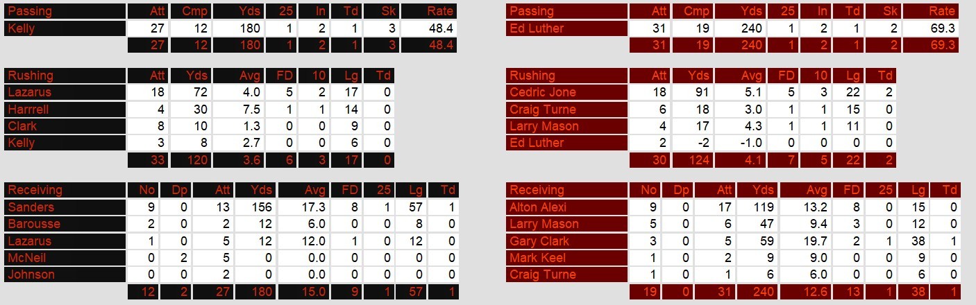 Houston found no purchase on the evening. Kelly, especially, suffered against a defense that sacked him 3 times and forced 3 turnovers. 2 of those turnovers were interceptions by Kelly. Houston looked to miss their running back Fowler for the first time since the trade as Harrell could muster only 72 yards rushing.