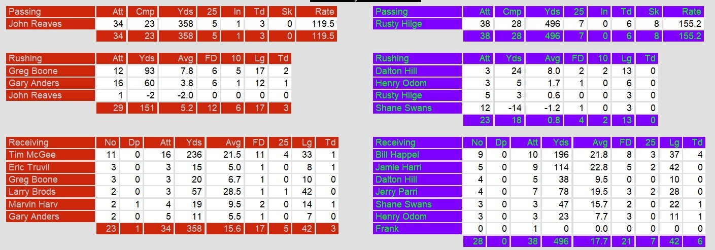 But, the Tampa run and pass game ground down New Orleans with a more balanced 3 touchdowns each. Hilger suffered some at the Tampa defense, too, enduring 8 sacks on the game. With the win, Tampa moves to 4-5 and within striking distance of the playoffs.