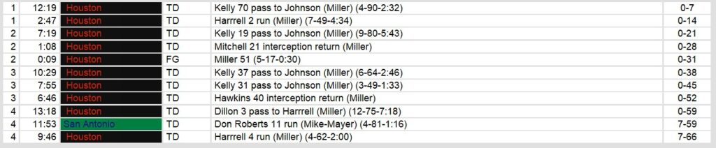 Dateline: Sunday, May 11, 1986. Houston absolutely obliterated San Antonio Sunday night at home. They scored touchdowns on Kelly passes, Dillon passes to Harrell, Harrell rushes, and 2 interception returns. They scored 59 points before San Antonio even made it onto the board.