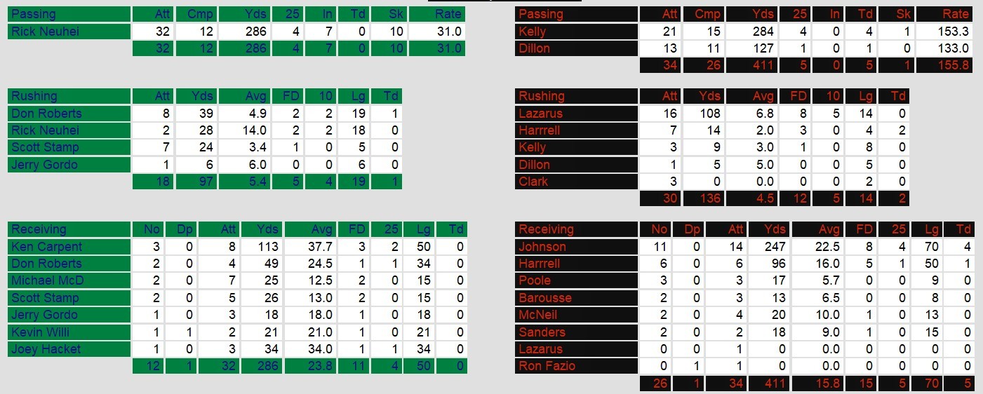 Dateline: Sunday, May 11, 1986. Houston absolutely obliterated San Antonio Sunday night at home. They scored touchdowns on Kelly passes, Dillon passes to Harrell, Harrell rushes, and 2 interception returns. They scored 59 points before San Antonio even made it onto the board.