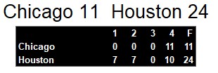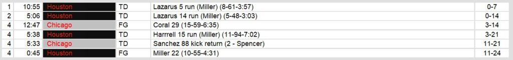 Dateline: Sunday May 16, 1986. Houston played just well enough to defeat division rival Chicago on Sunday afternoon. Jim Kelly threw only 13 passes in the game, completing nine for 111 yards. However, their running back took over, gaining 201 yards and scoring 2 touchdowns in the game.