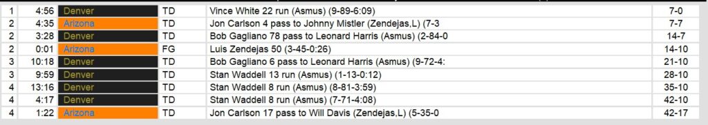 Dateline: Sunday May 16, 1986. Denver exploded in the second half to defeat Arizona in Tempe Sunday evening. After a back and forth first that saw the gold leading only 14-10, they scored 4 unanswered touchdowns. The outburst included 3 straight rushing touchdowns by Stan Waddell.
