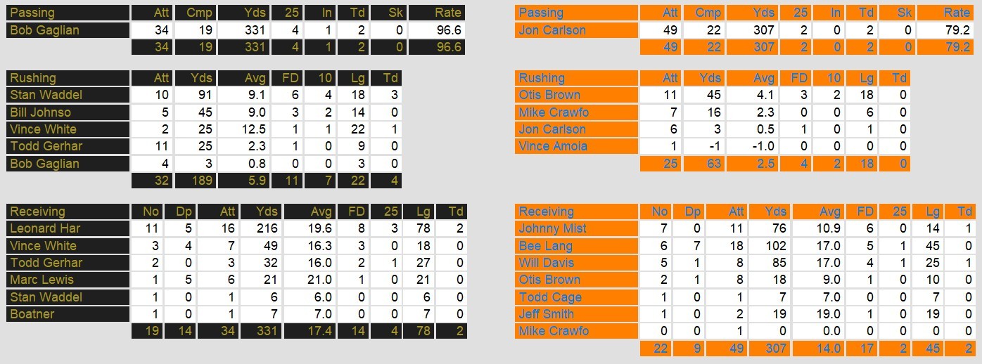 Dateline: Sunday May 16, 1986. Denver exploded in the second half to defeat Arizona in Tempe Sunday evening. After a back and forth first that saw the gold leading only 14-10, they scored 4 unanswered touchdowns. The outburst included 3 straight rushing touchdowns by Stan Waddell.