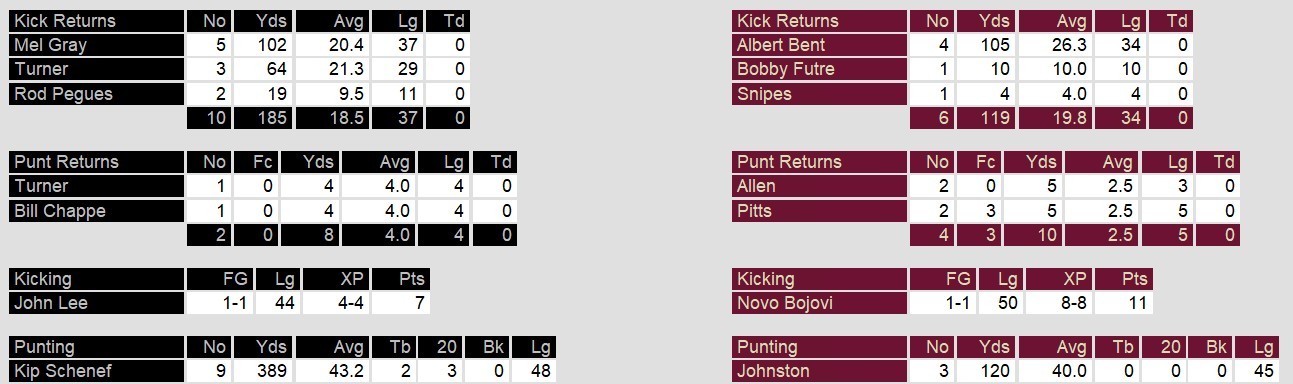 Oklahoma quarterback Rick Johnson threw 3 touchdowns in the loss. He also threw one interception, that turned into another touchdown for Michigan. The Outlaws were simply outmatched. Michigan gained 567 yards of offense and held the ball for almost 42 minutes in the game.
