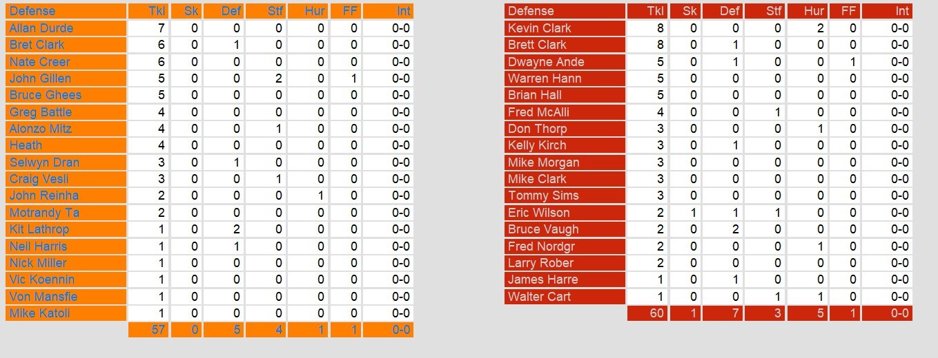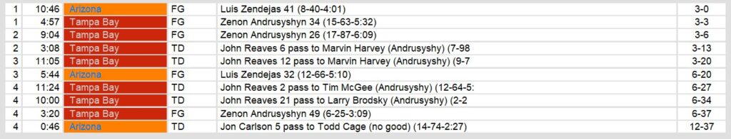 Arizona struggled to find the end zone all game, scoring on only 4 Luis Zendejas field goals. Reeves’ counterpart, Jon Carlson struggled on the day. He threw for only 183 yards on 21 completions and a late touchdown after the game was decided.