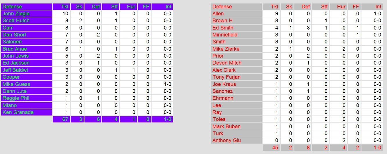 New Orleans quarterback Rusty Hilger couldn’t make up for the lack of a run game. He completed only 19 passes on 47 attempts for 319 yards. Both facets of the offense contributed to the Brass holding the ball for only 22 mintues in the game.