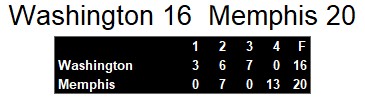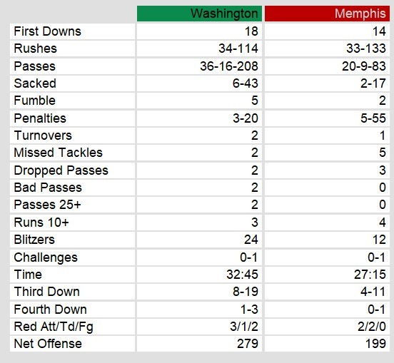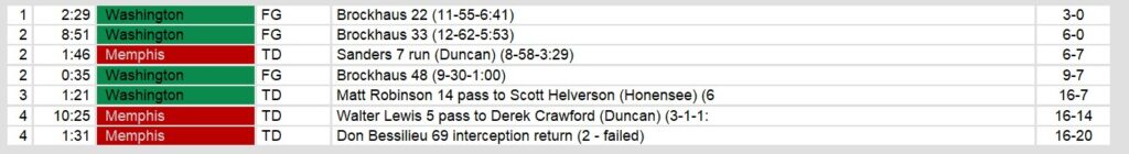 Washington led 16-7 going into the fourth. They built the lead with long drives and ball control. Their defense just couldn’t stop Memphis any longer. Then Matt Robinson made the mistake of the game on the pick six.