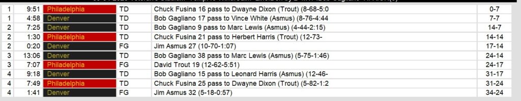 Dateline: Sunday, May 24, 1986. Denver defeated Philadelphia Sunday afternoon to put their record to 10-5. They remain near the top in the competitive West with Los Angeles and surprise Las Vegas. Quarterback Bob Gagliano connected on 4 touchdown passes to three different receivers.