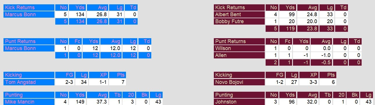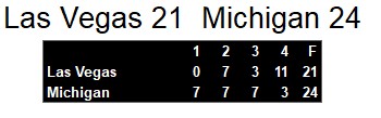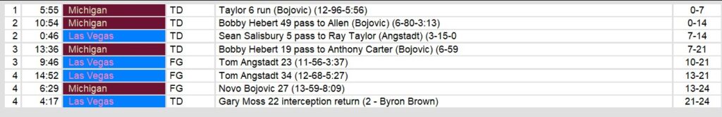 Vegas scored two field goals to pull within 11. Gary Moss returned an interception for a touchdown and Vegas converted the 2 points. After a Michigan punt, Vegas had a chance to drive for the tying field goal or winning touchdown. However, Salisbury, didn’t have the same magic as Cunningham and they fell short.