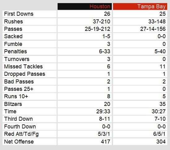 In spite of dominating the stat sheet, Houston never led in the game after tying it at 7-7 late in the first quarter. Three turnovers doomed the potent Houston offense. They gained over 200 yards both passing and rushing, but the turnovers handed the game to the Bandits.