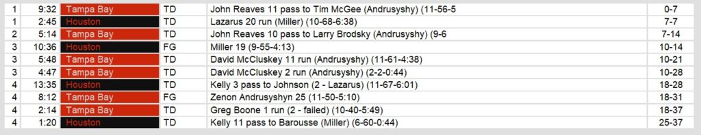 Dateline: Monday, May 26, 1986. Tampa Bay pulled off a bit of a shocker Monday night defeating Houston. Quarterback John Reaves was efficient in the win, throwing for less than 160 yards, but connecting on two touchdowns. Likewise, the running backs worked as a committe, gaining 148 yards together and scoring three touchdowns.