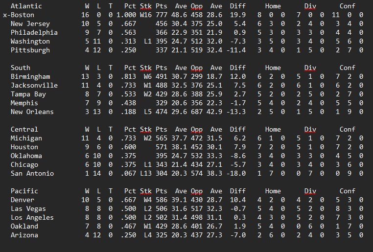 Division leaders Birmingham, Boston, and Denver all won easily. Boston ran away with their division as the only undefeated team. All three other teams hold significant leads with only 3 weeks left in the season. Come back next week for more exciting action and to see if any other teams punch their tickets to the playoffs!