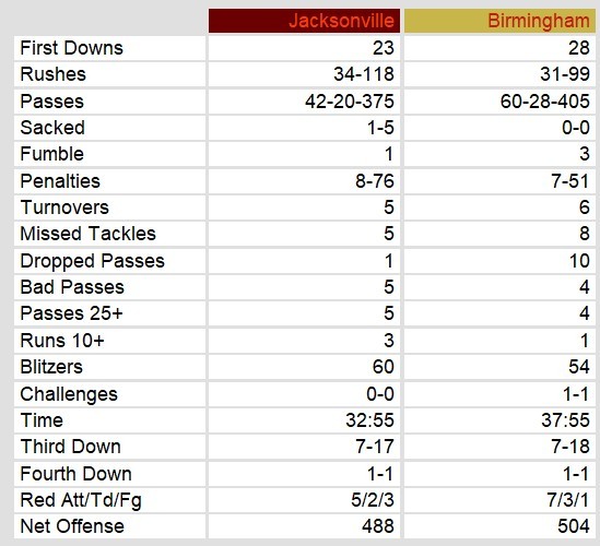 Jacksonville has another chance to snag a win next week against San Antonio. Birmingham gets to rest for two weeks until their first playoff game.