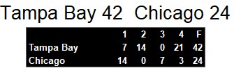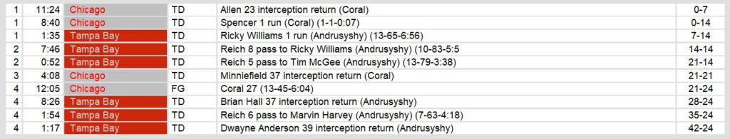 Dateline: Sunday, June 1, 1986. Another game, another blowout Sunday afternoon. Tampa Bay, like Memphis, held Chicago under 200 total yards of offense. They returned 3 intercptions for touchdowns and their backup quarterback Frank Reich handled the game well.