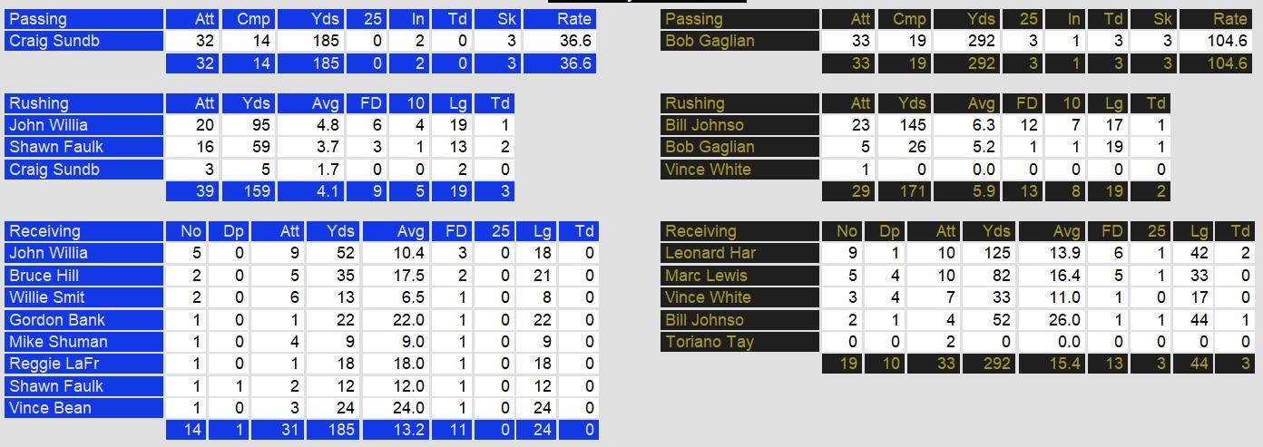 Dateline: Sunday, June 1, 1986. In keeping with the theme, the final Sunday night game of week 19 provided little in the way of drama. Both teams went into the 4th quarter tied at 24. Denver then scored the final two touchdowns of the game to seal the victory.