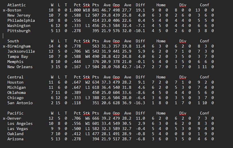 Boston and Birmingham each take the 1 and 2 spot in the east and will get a wild card round bye. New Jersey, Philadelphia, Jacksonville, and Tampa Bay all vie for the remaining spots. The possibilities are myriad and three of those teams have a game in week 20, so that makes things even more exciting.